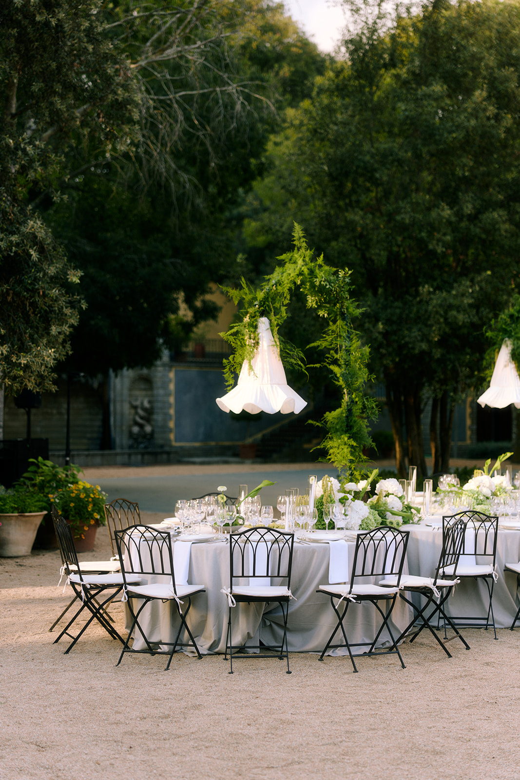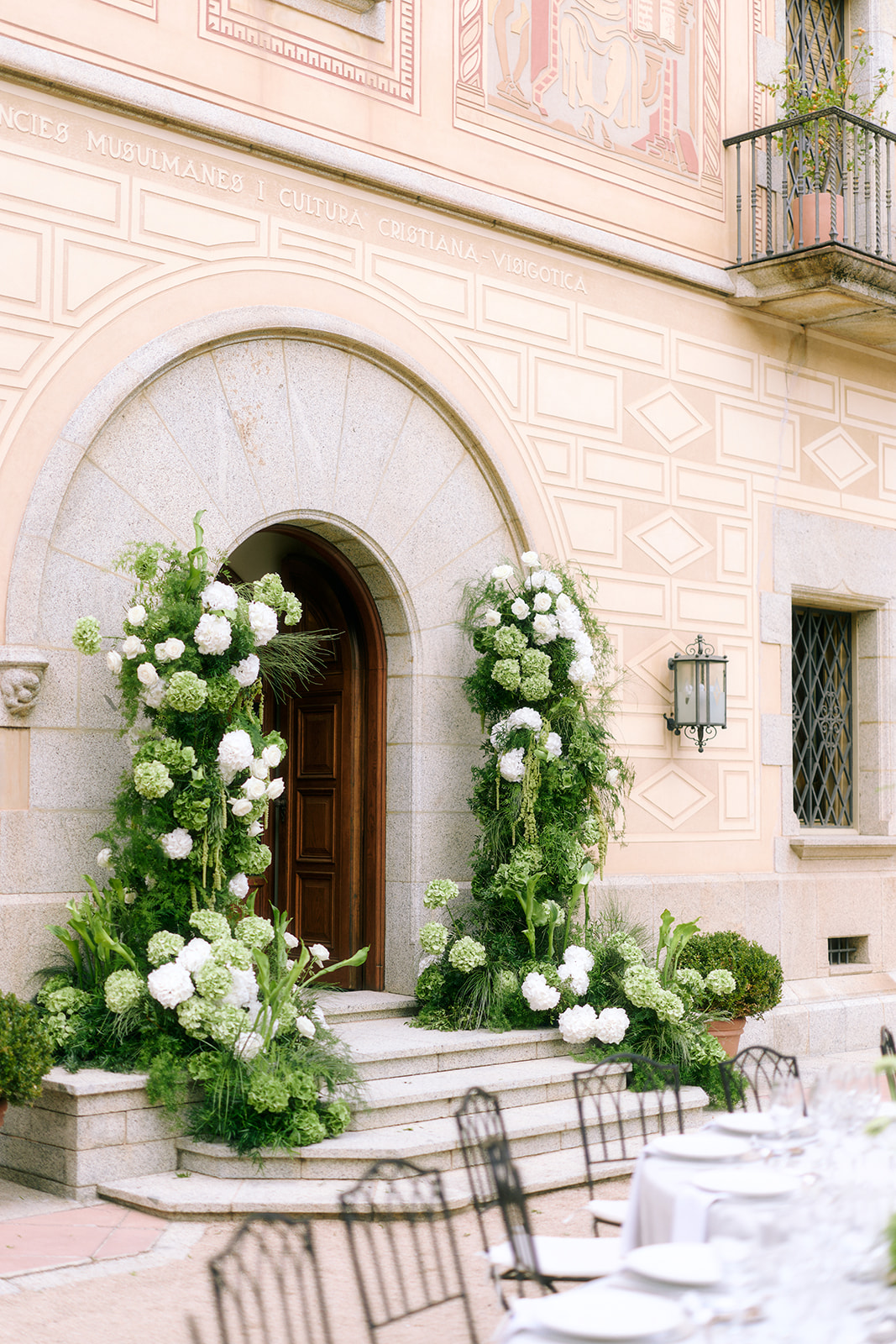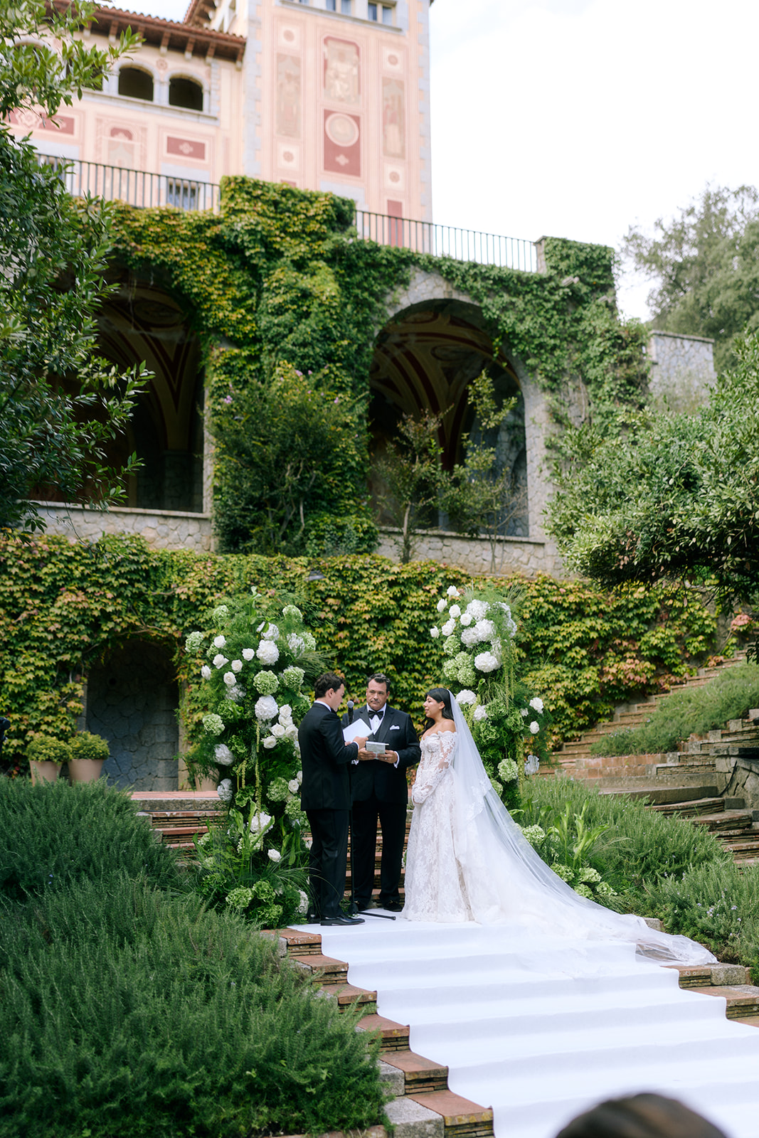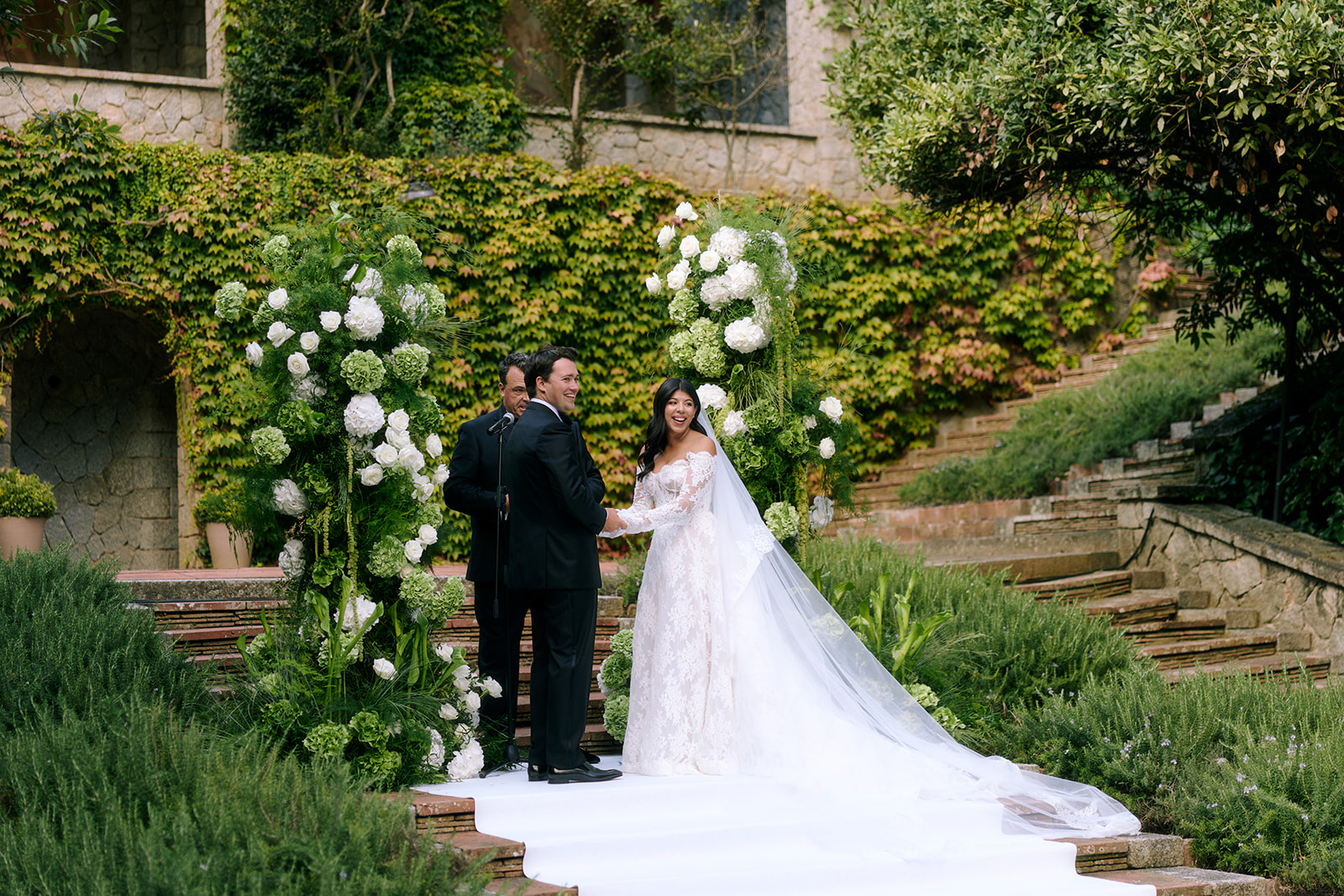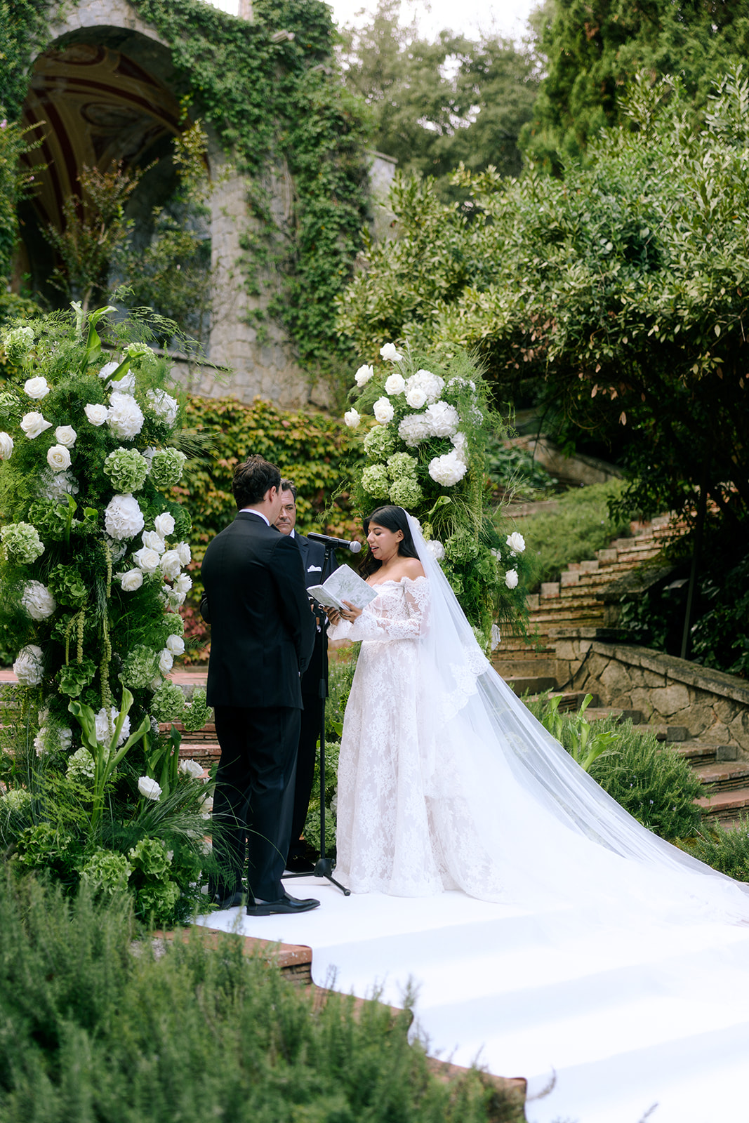 The ceremony took place outdoors, framed by greenery and romantic white blooms by Flors Amelia. The floral design highlighted the natural beauty of the venue while creating a dreamy, sophisticated setting for their vows.