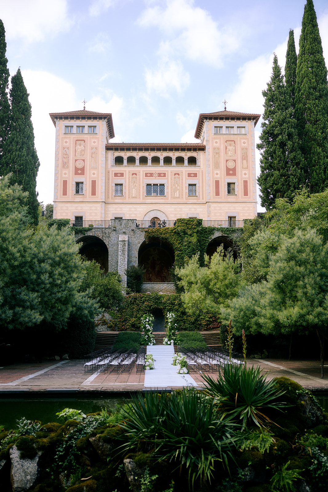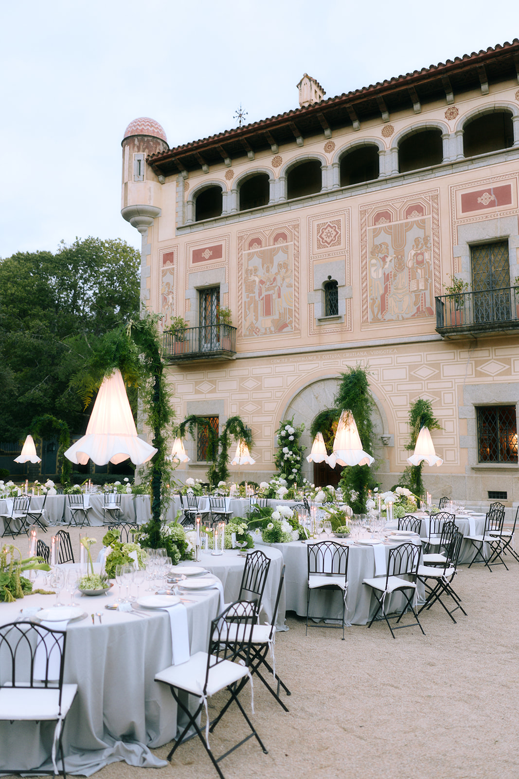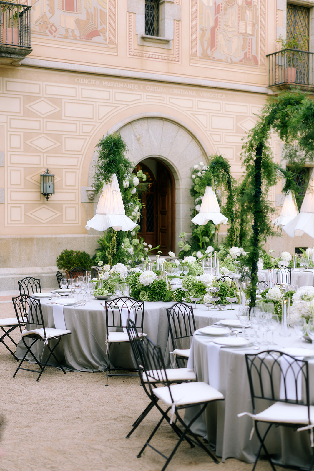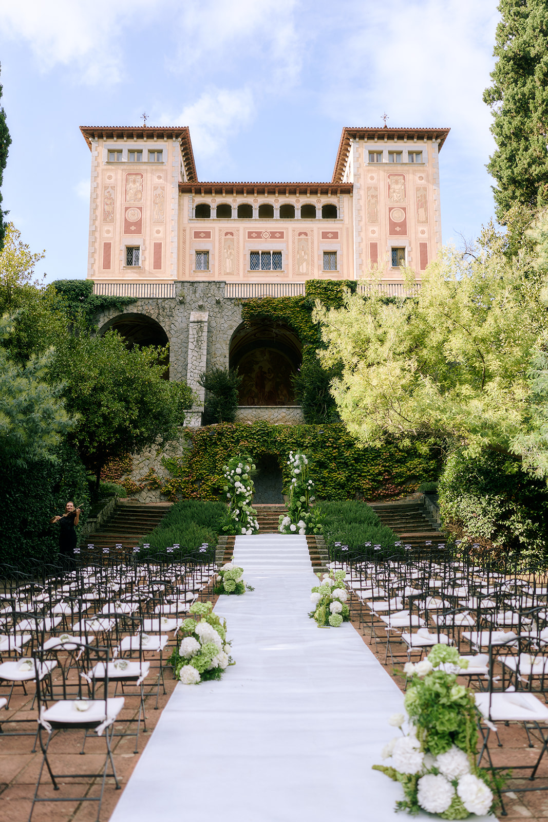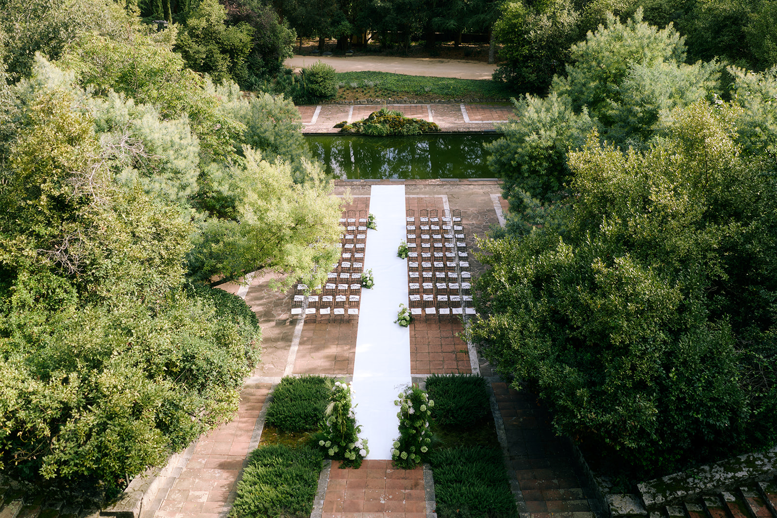 The ceremony took place outdoors, framed by greenery and romantic white blooms by Flors Amelia. The floral design highlighted the natural beauty of the venue while creating a dreamy, sophisticated setting for their vows.