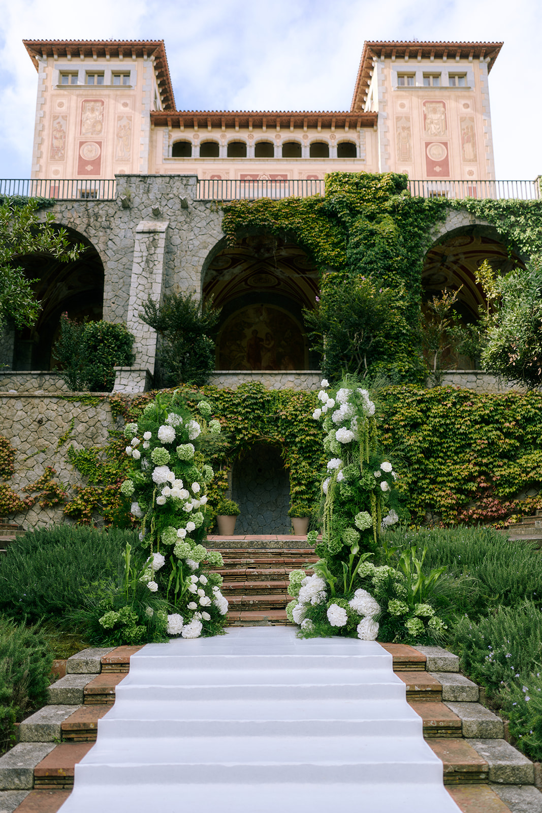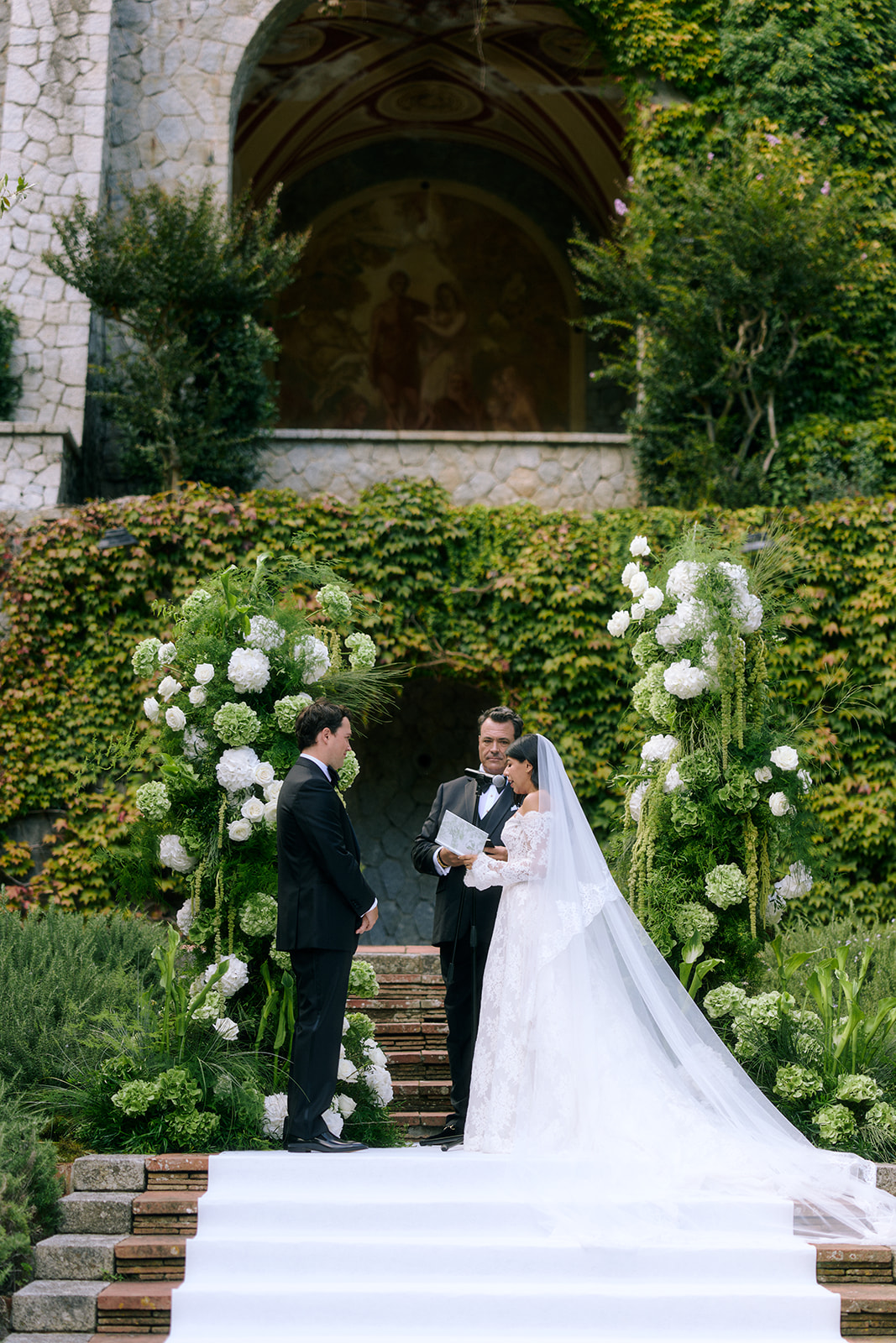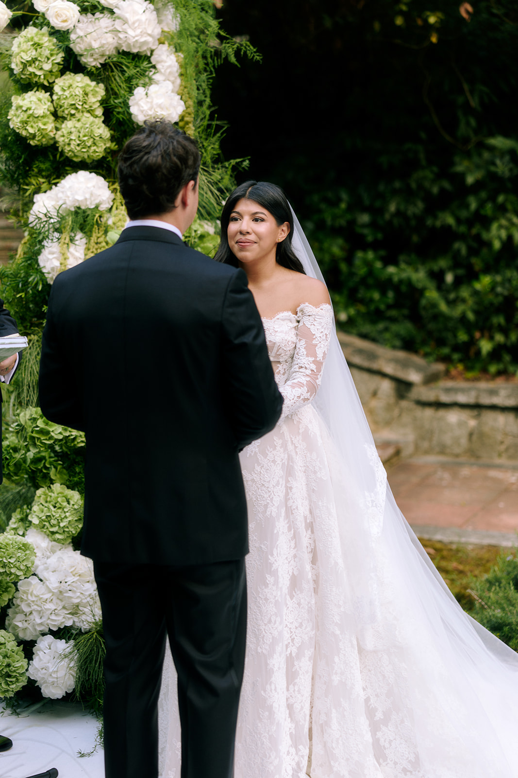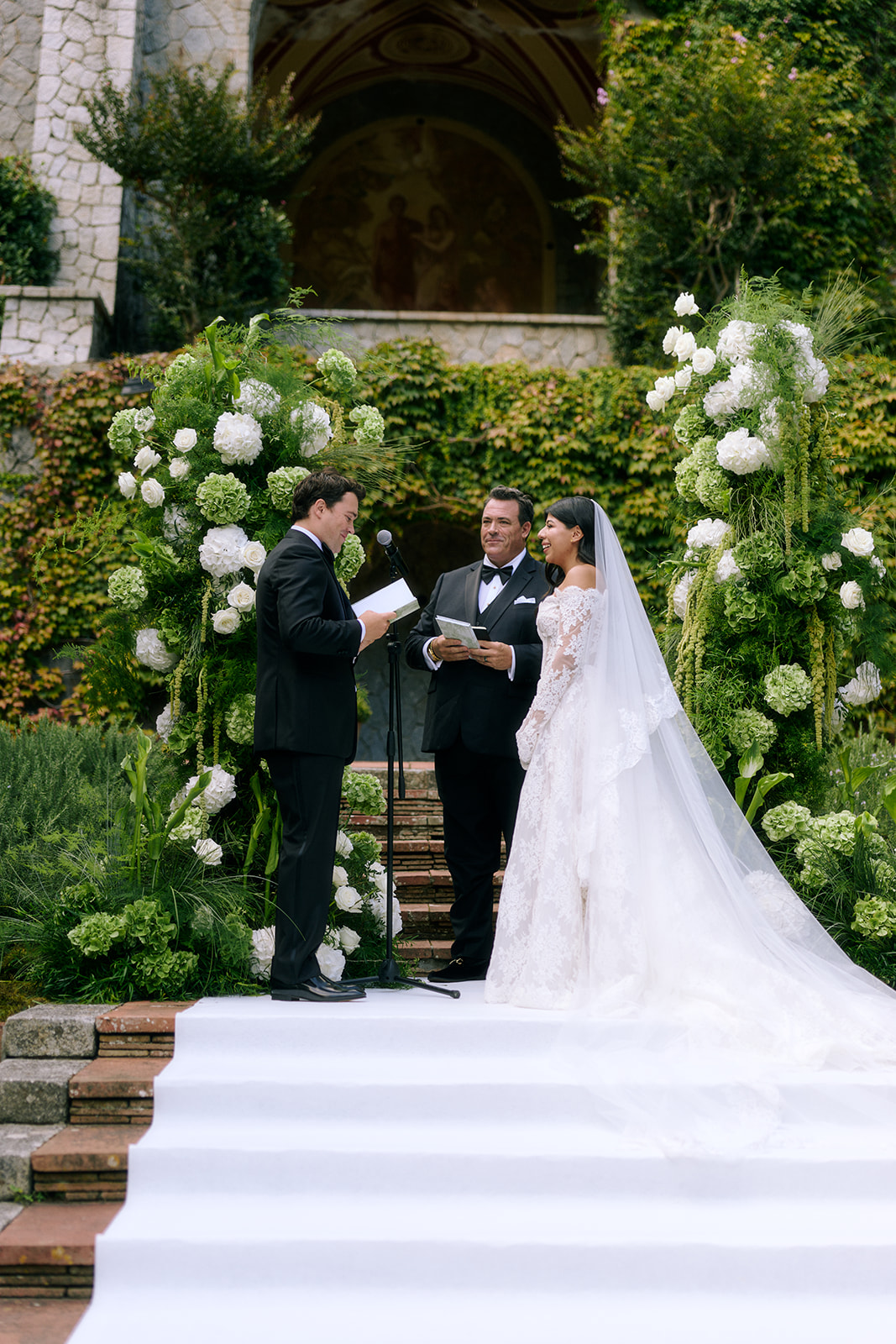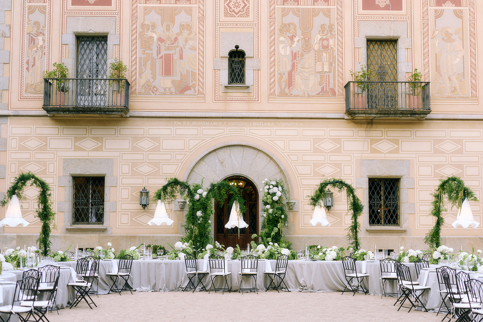 The ceremony took place outdoors, framed by greenery and romantic white blooms by Flors Amelia. The floral design highlighted the natural beauty of the venue while creating a dreamy, sophisticated setting for their vows.