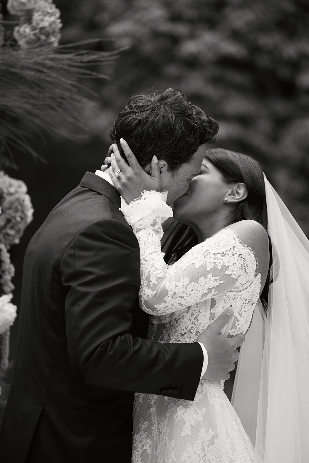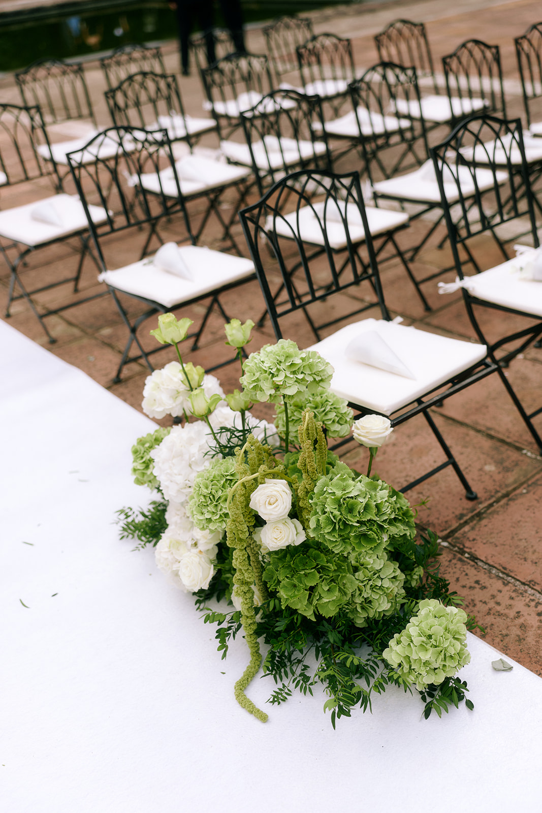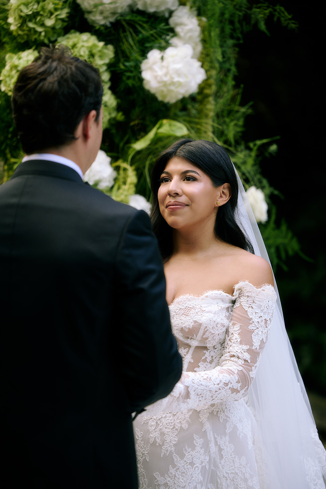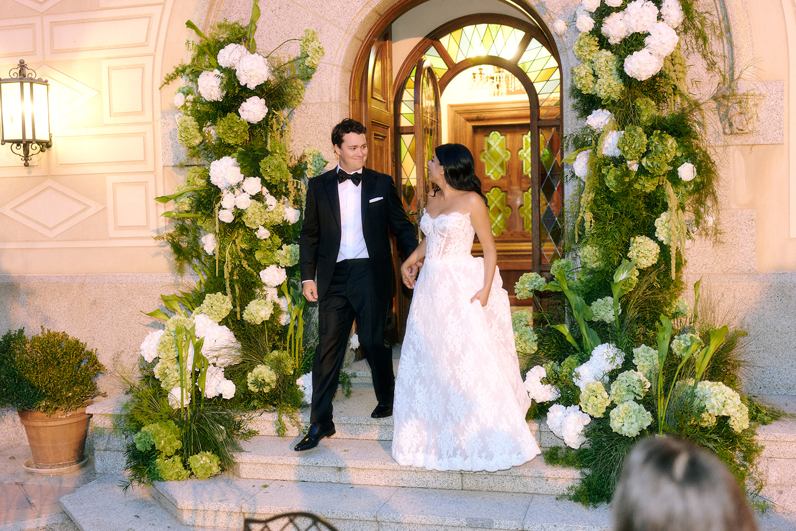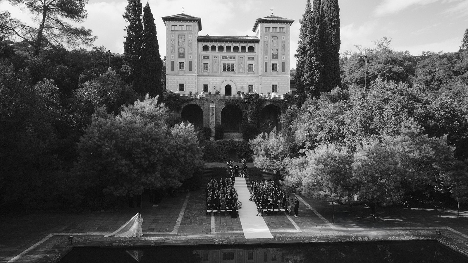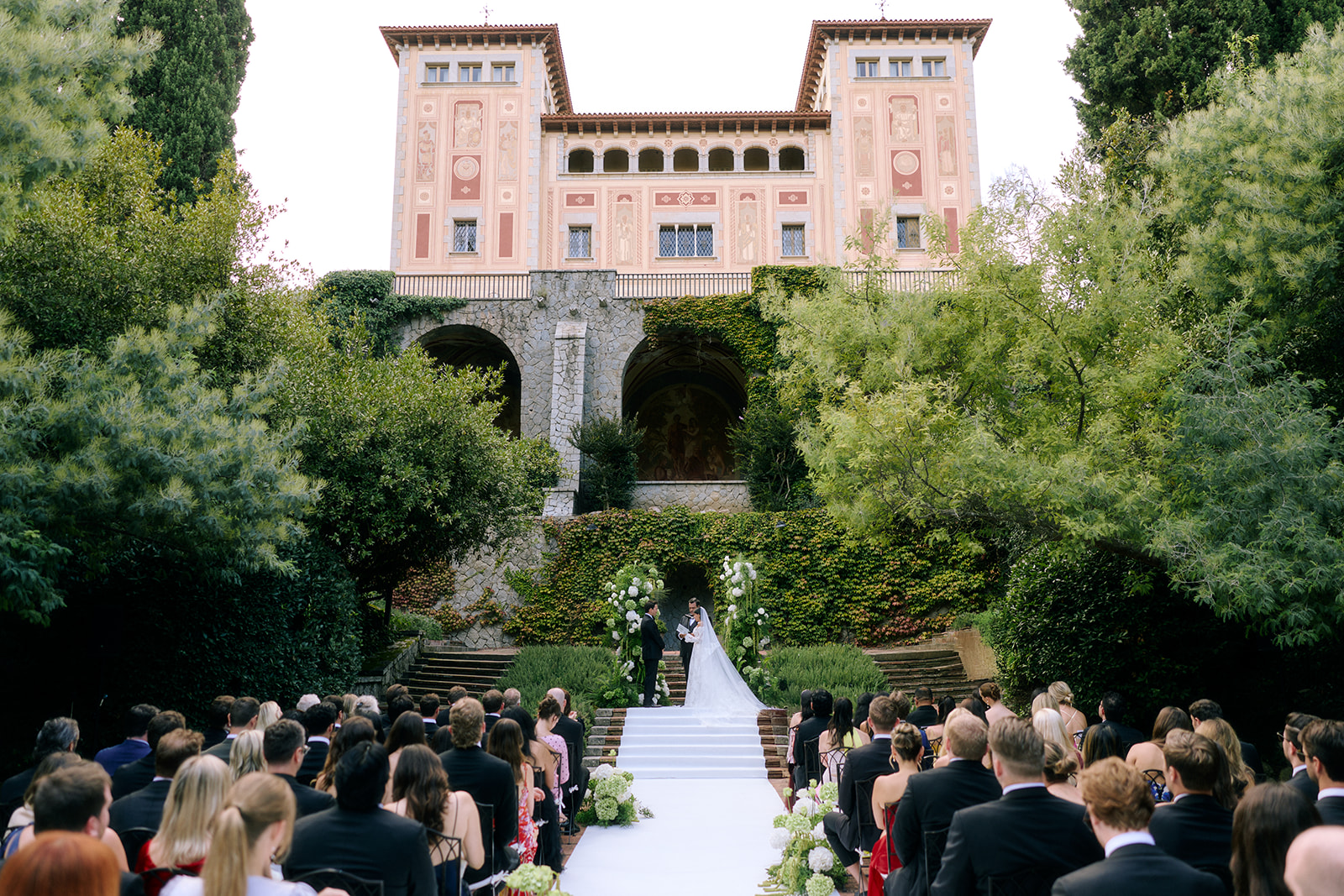 The ceremony took place outdoors, framed by greenery and romantic white blooms by Flors Amelia. The floral design highlighted the natural beauty of the venue while creating a dreamy, sophisticated setting for their vows.