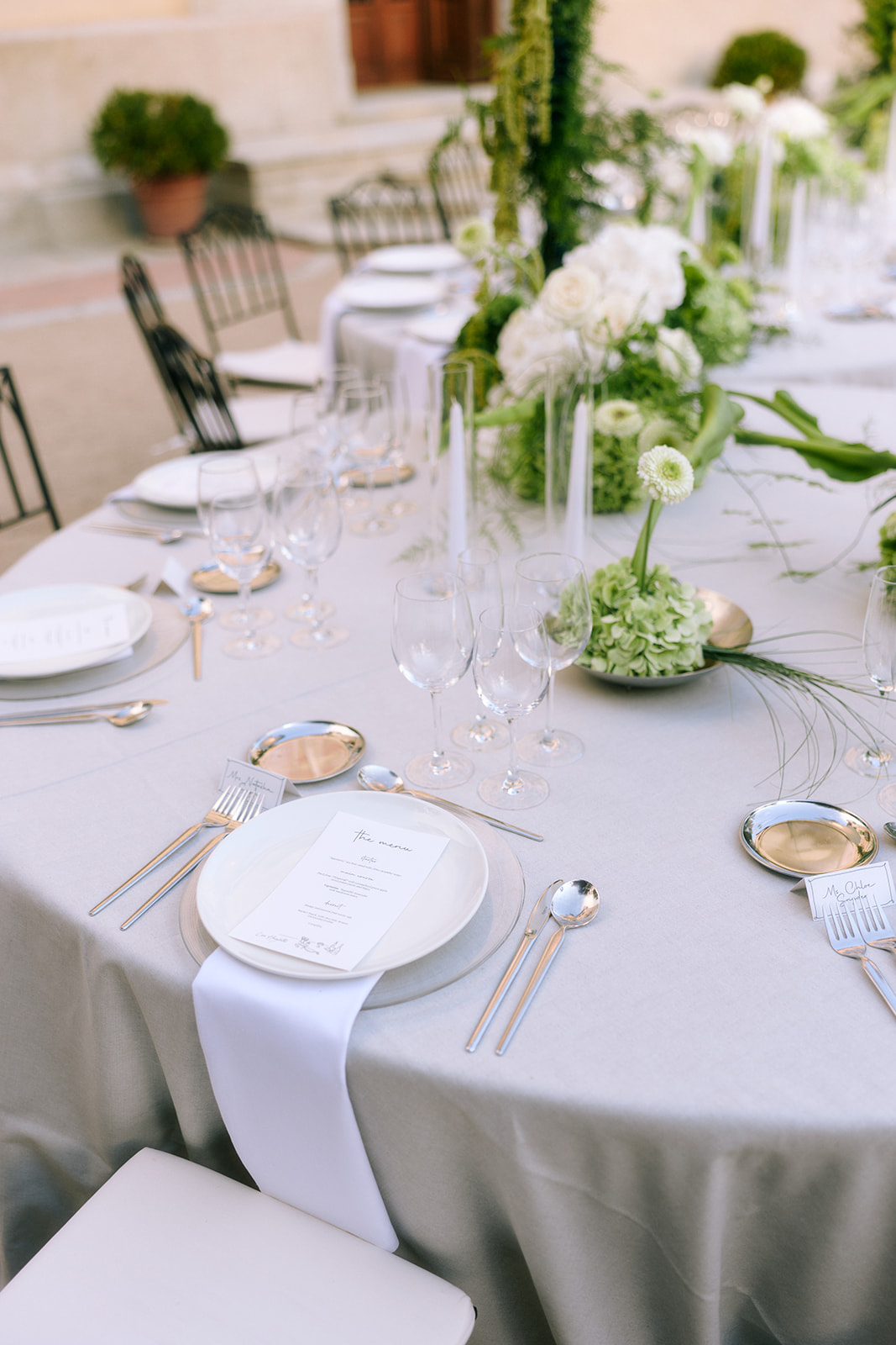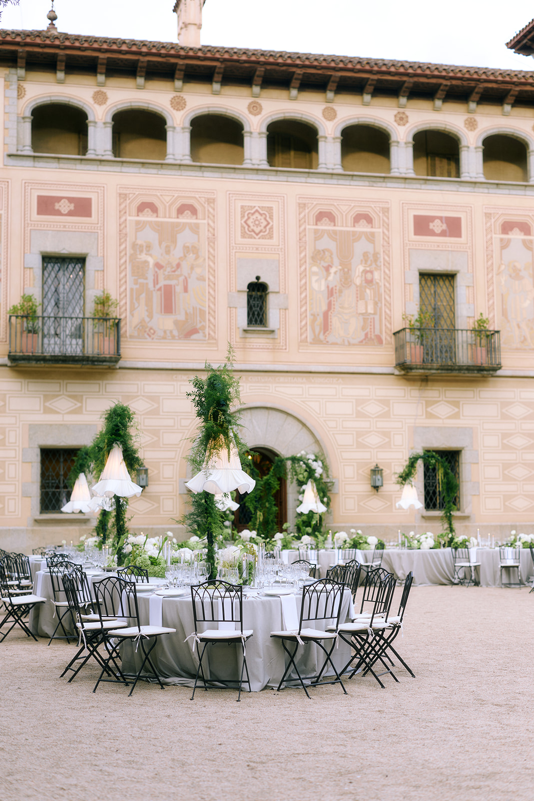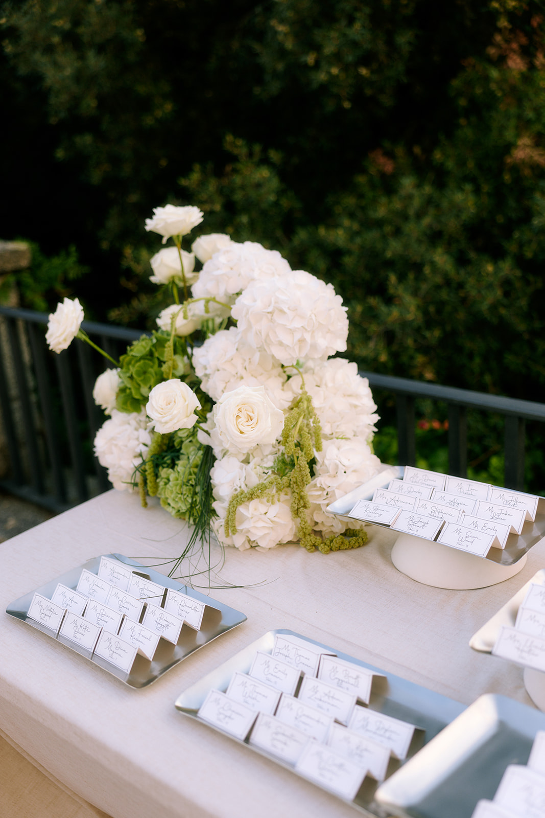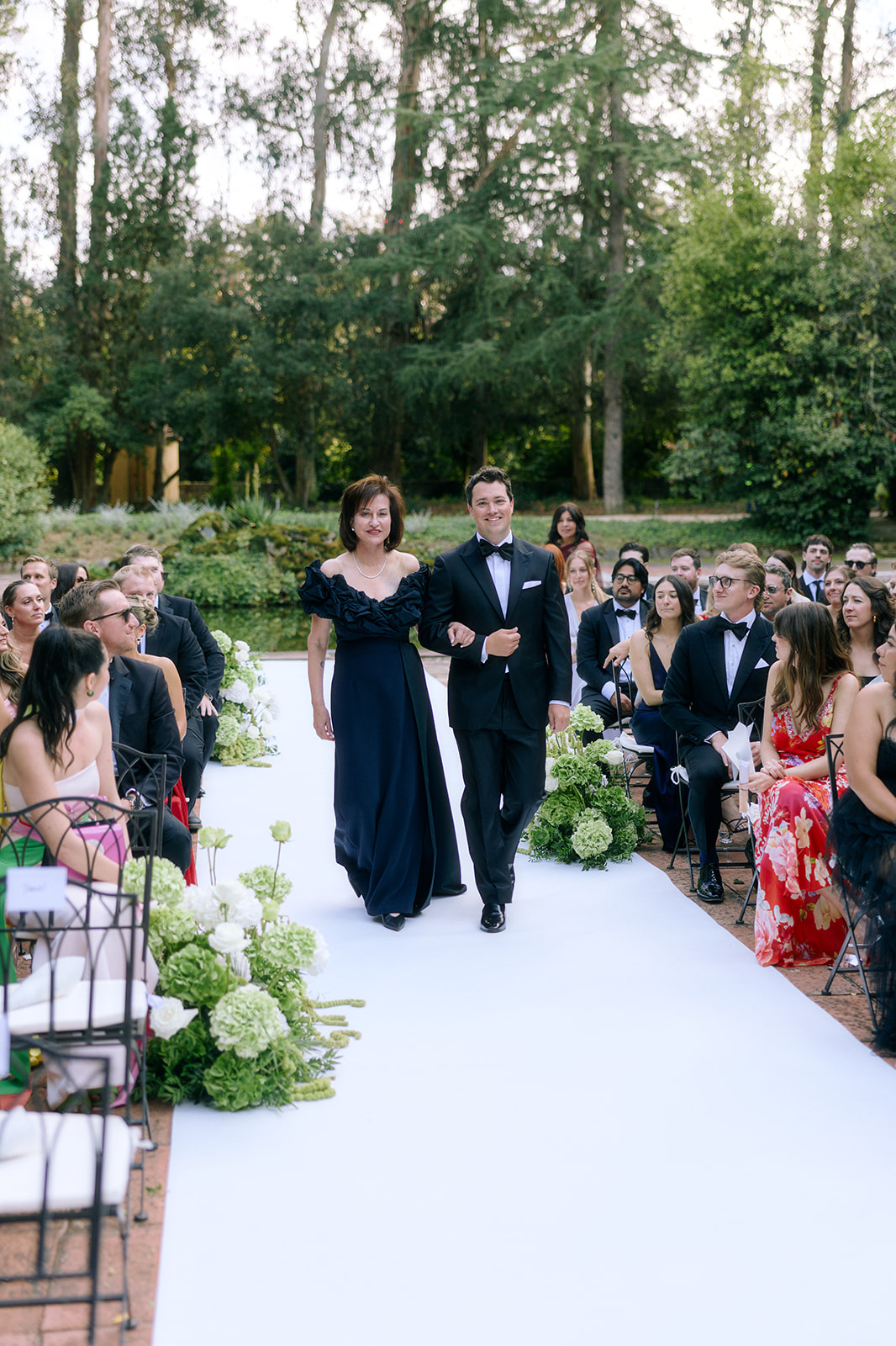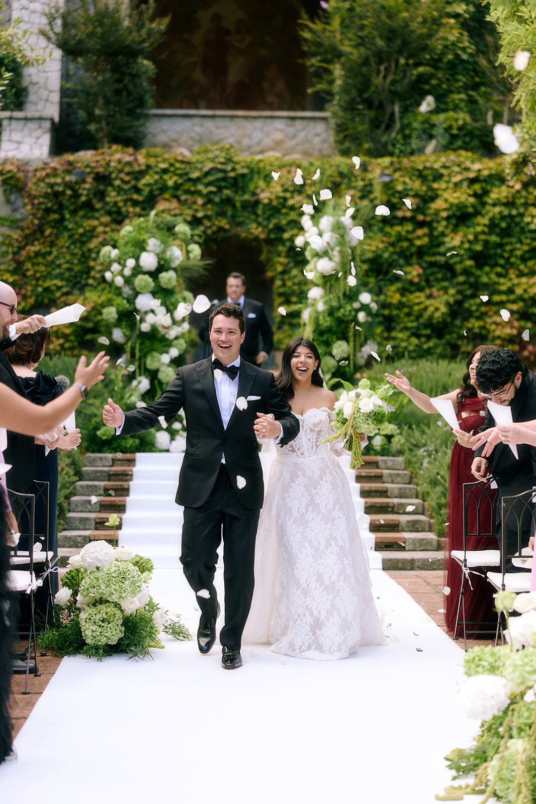 The ceremony took place outdoors, framed by greenery and romantic white blooms by Flors Amelia. The floral design highlighted the natural beauty of the venue while creating a dreamy, sophisticated setting for their vows.
