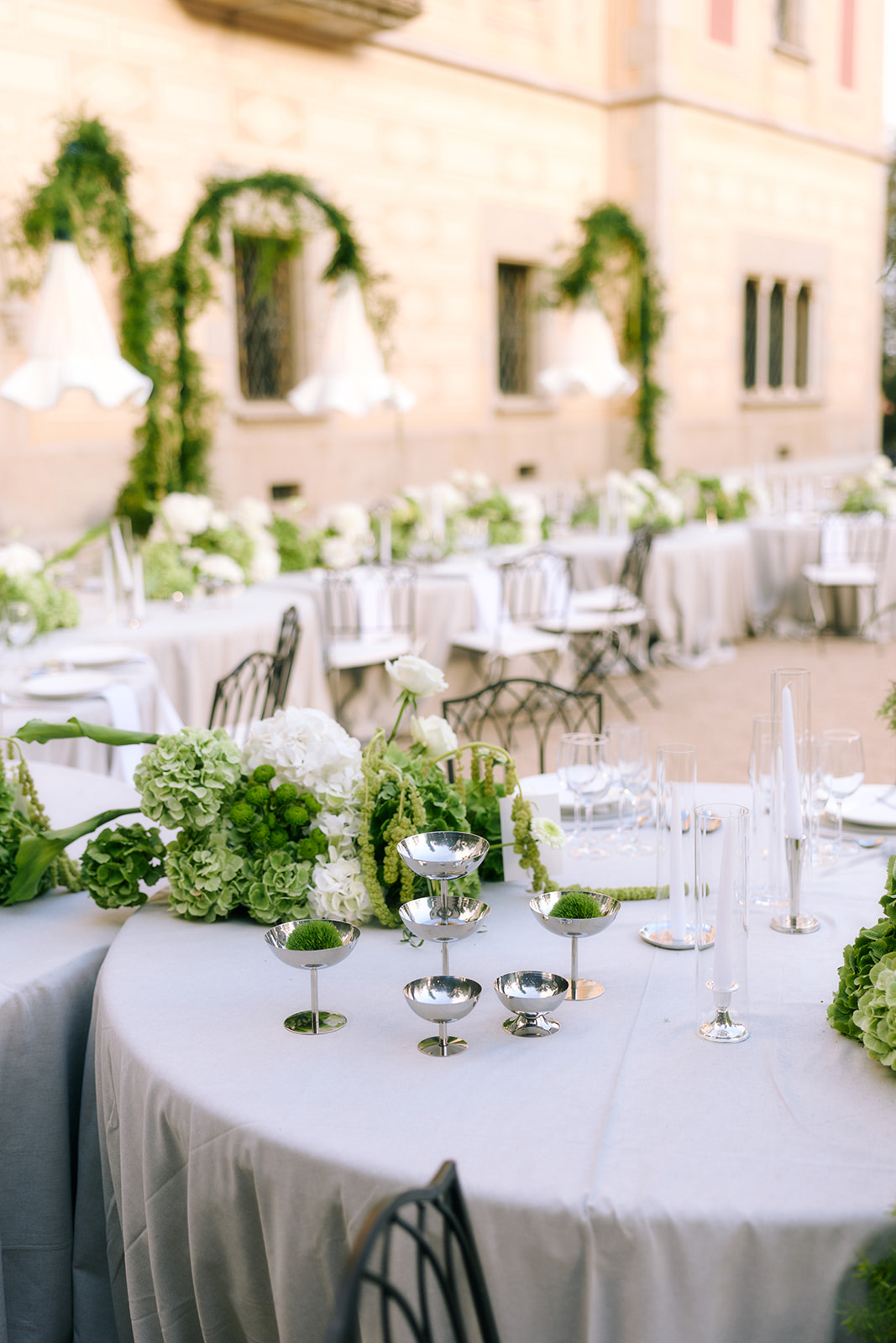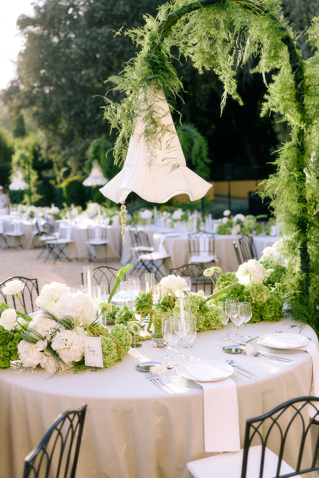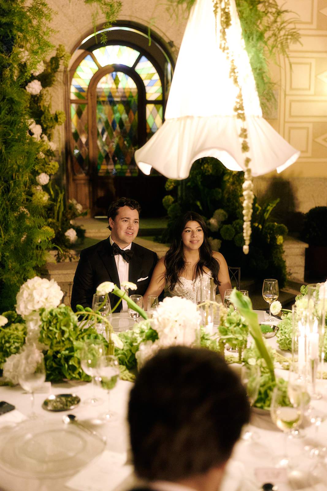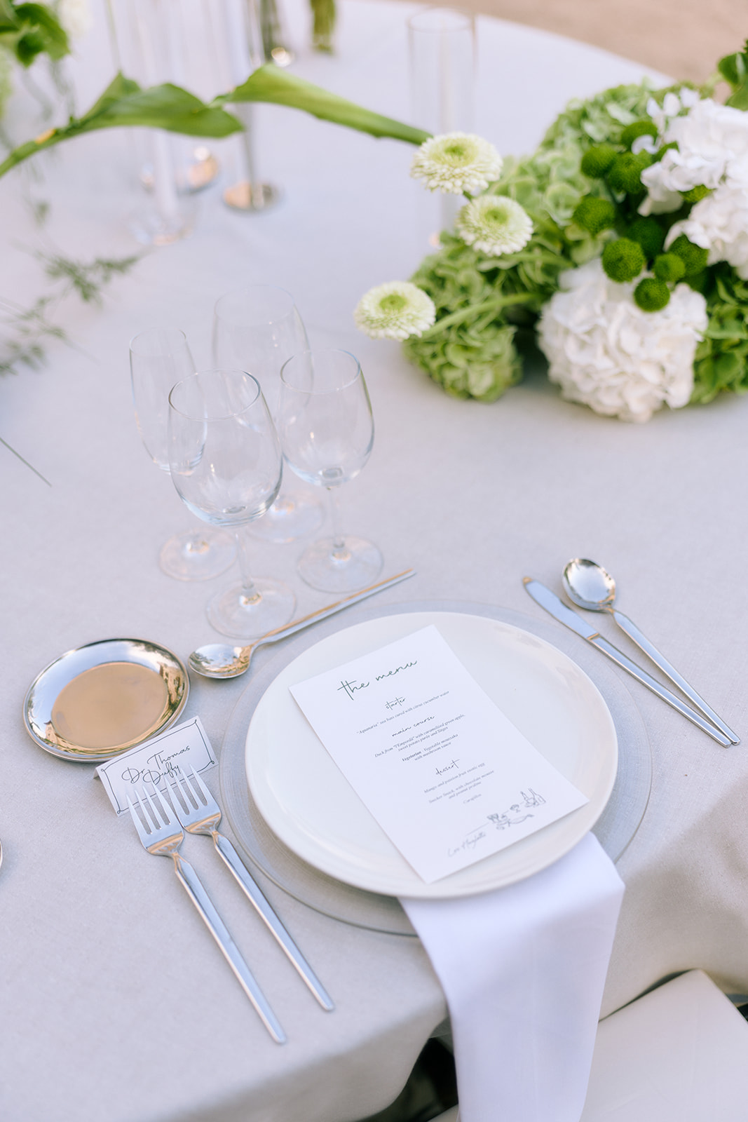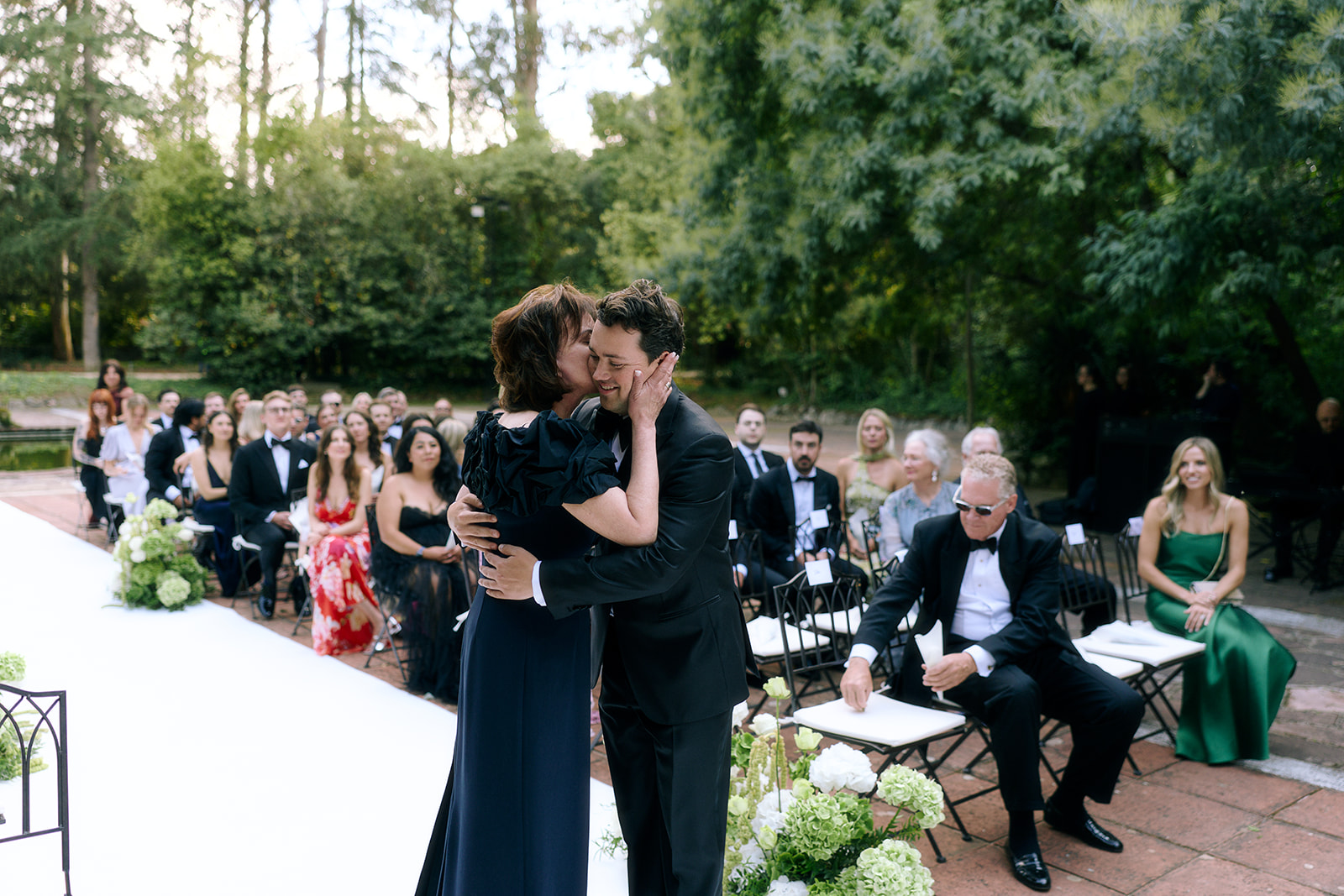 The ceremony took place outdoors, framed by greenery and romantic white blooms by Flors Amelia. The floral design highlighted the natural beauty of the venue while creating a dreamy, sophisticated setting for their vows.
