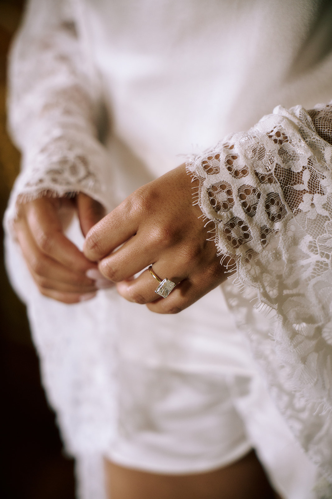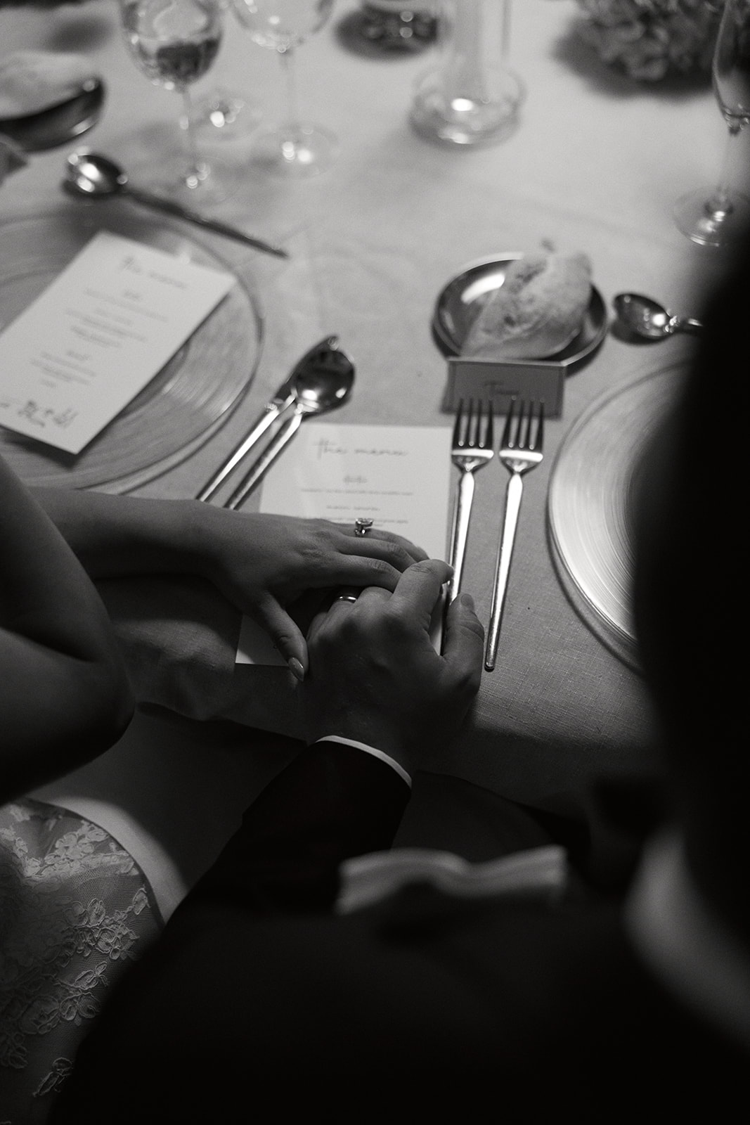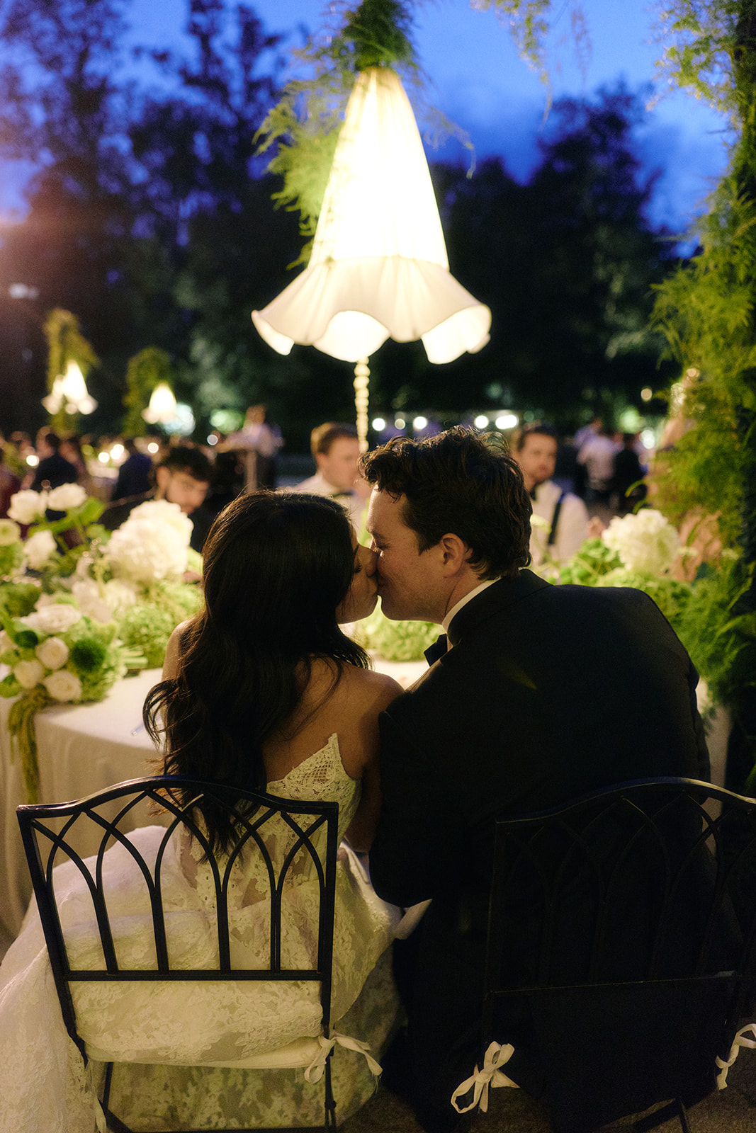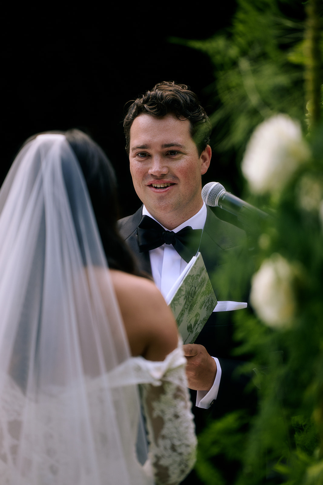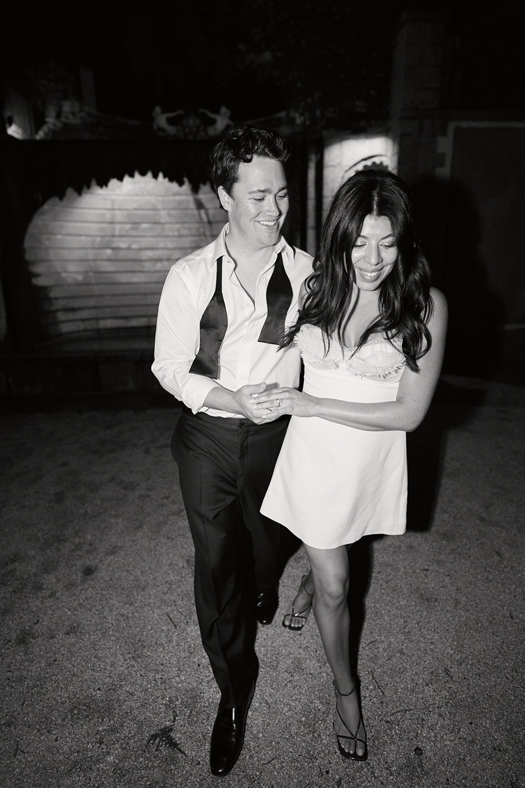 The ceremony took place outdoors, framed by greenery and romantic white blooms by Flors Amelia. The floral design highlighted the natural beauty of the venue while creating a dreamy, sophisticated setting for their vows.