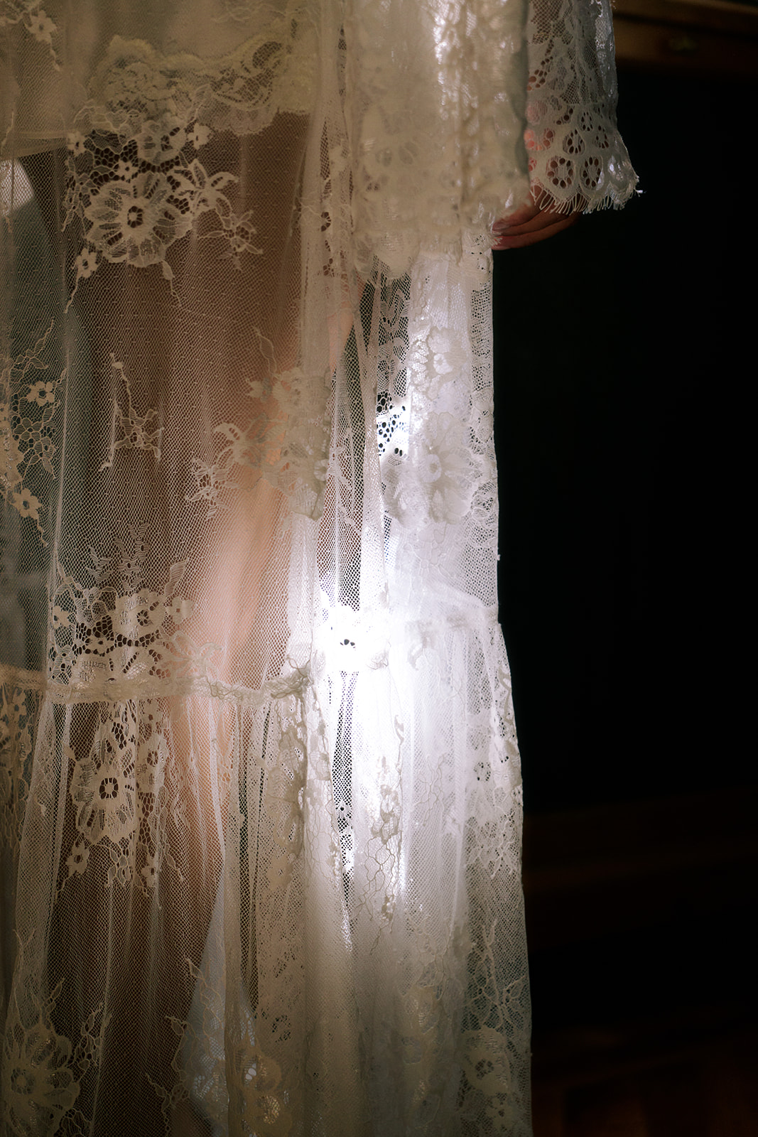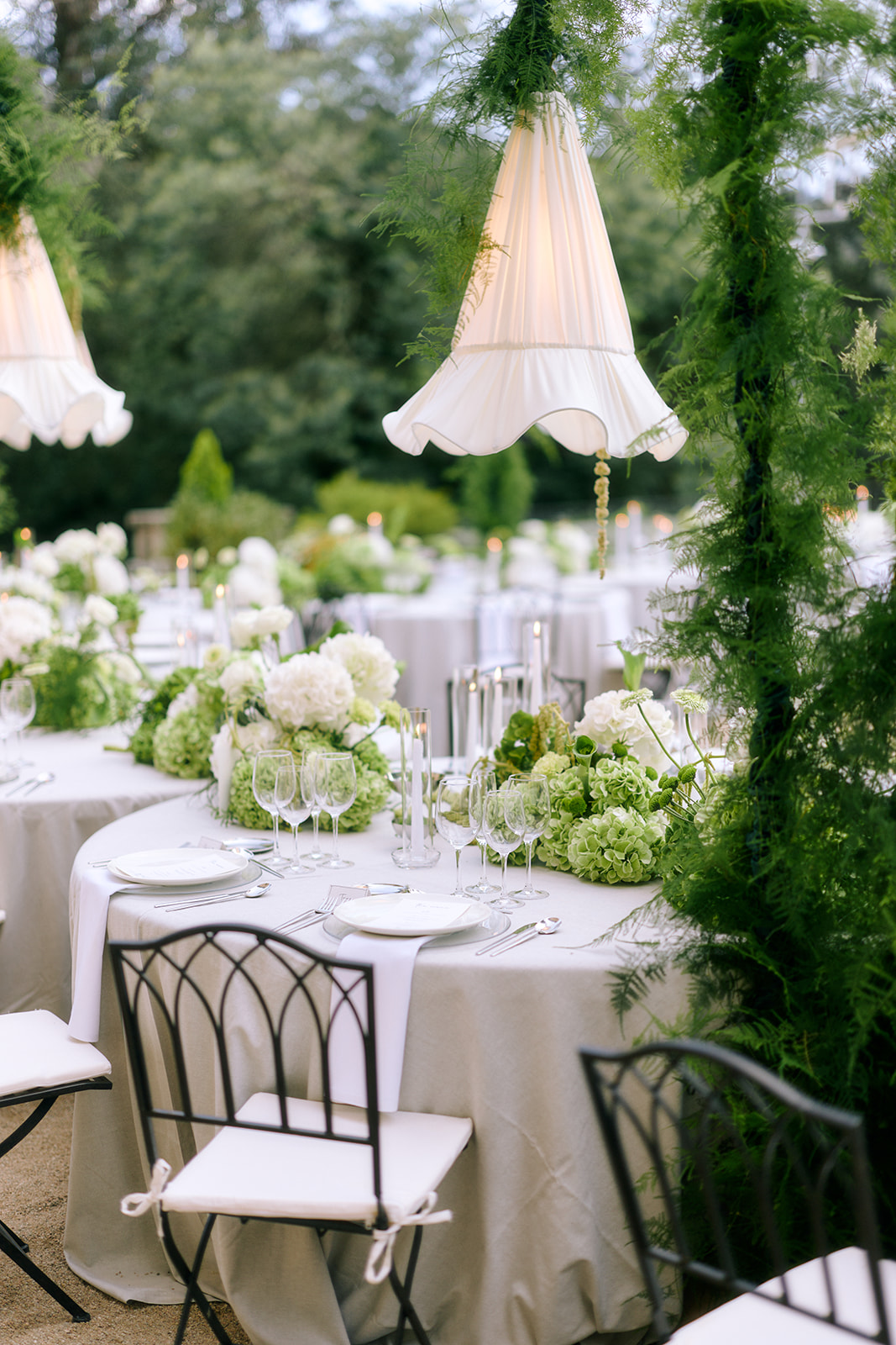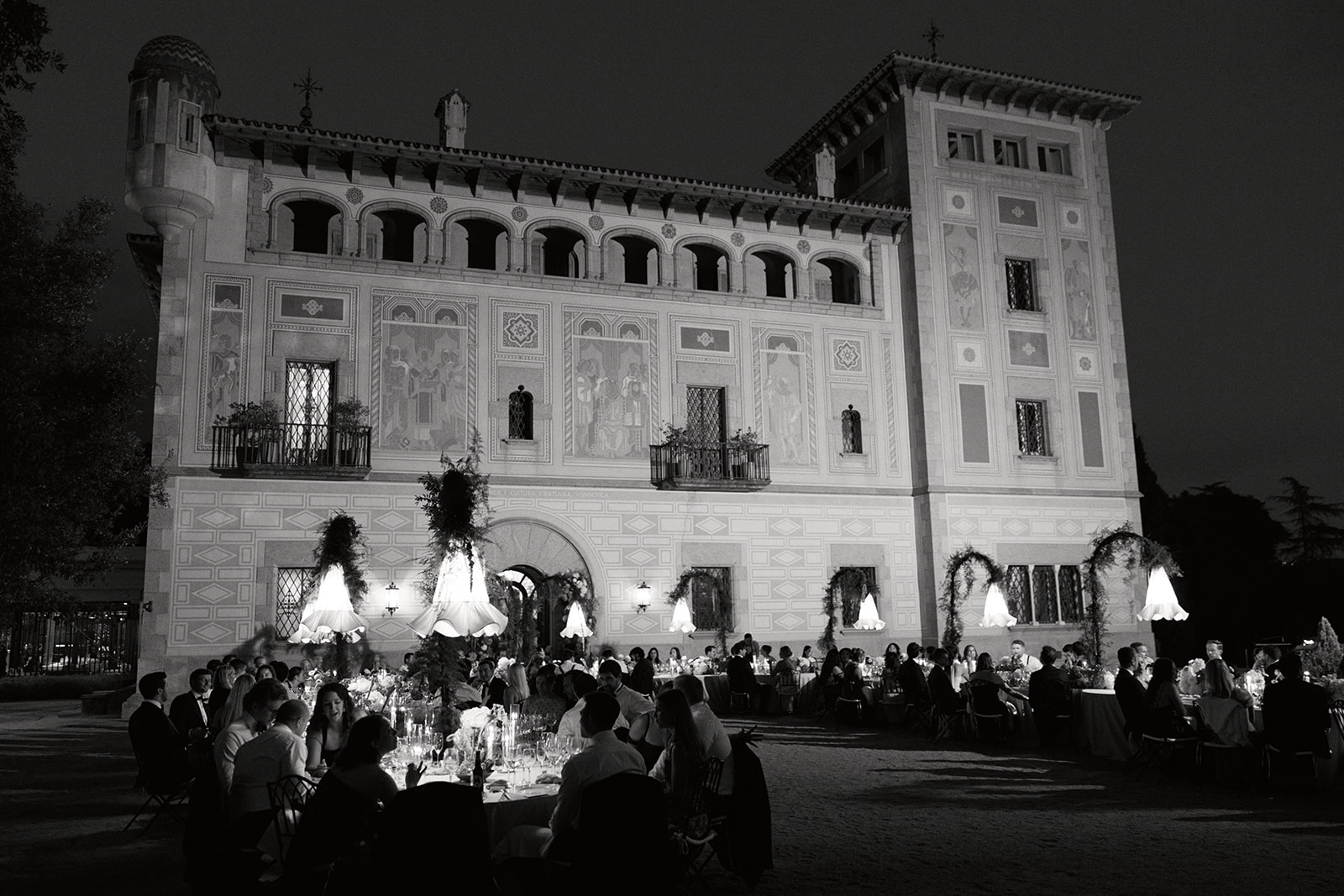 Dinner was served in the open-air courtyard, beautifully catered by Sensacions. Under hanging lamps and candlelight, tables were dressed in soft sand and white tones, adorned with lush hydrangeas and roses. The setting combined sophistication with warmth, reflecting the couple’s refined taste and relaxed spirit.
